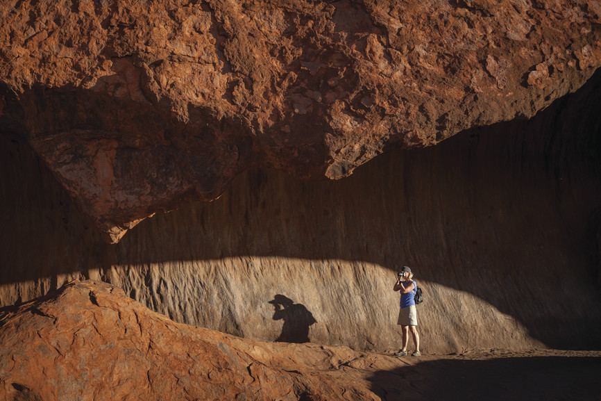 Tourist photographing in cave at Uluru (formerly Ayer’s Rock), Uluru-Kata Tjuta National Park, Australia. UNESCO World Heritage Site.